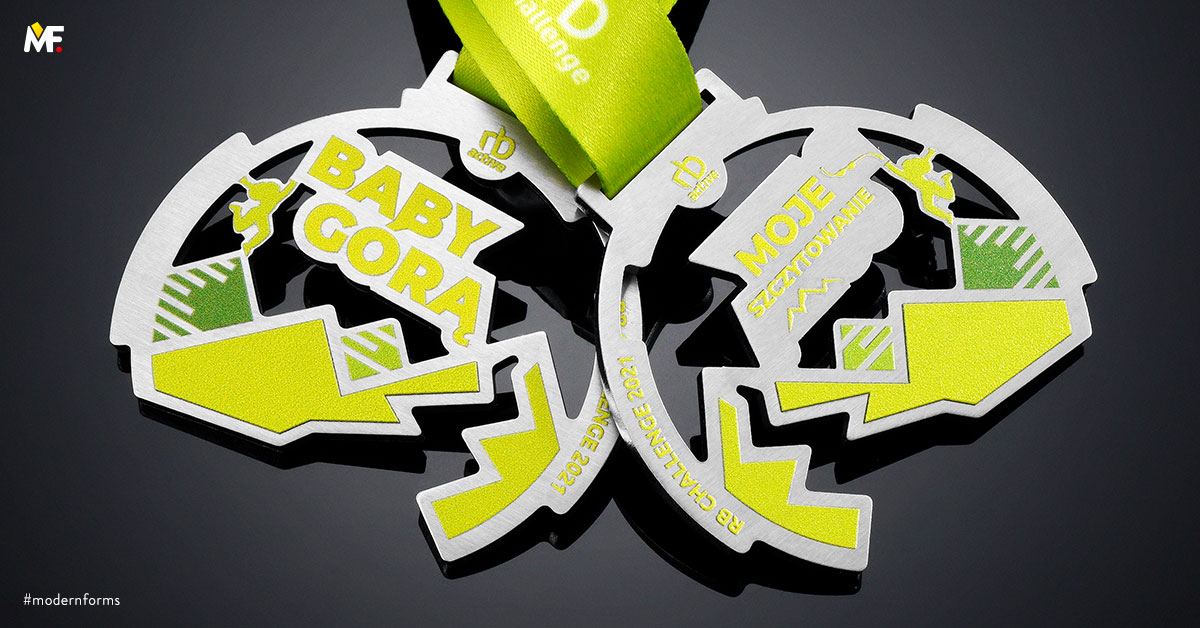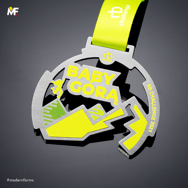 Medal nieregularny, ażurowany, jednoelementowy, dwustronny, wykonany z stali szczotkowanej. Teksturowany przestrzennie z dopasowaną kolorystycznie wstążką z nadrukiem. Istnieje możliwość dopasowania wzoru do wytycznych klienta.