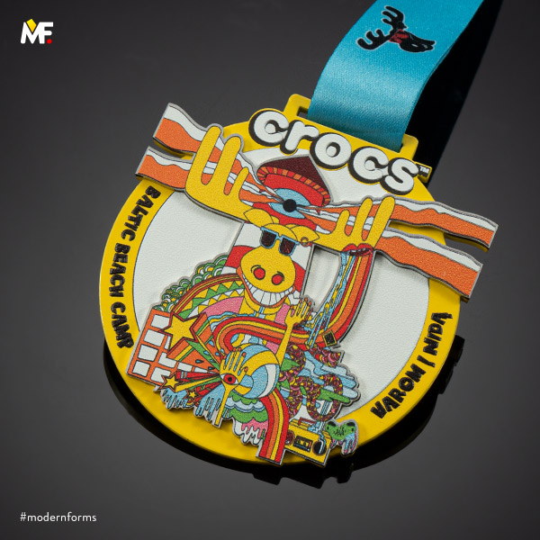 Medal nieregularny, dwuelementowy, jednostronny, wykonany z metalu malowanego ma kolor żółty. Teksturowany przestrzennie z dopasowaną kolorystycznie wstążką z nadrukiem. Istnieje możliwość dopasowania wzoru do wytycznych klienta.