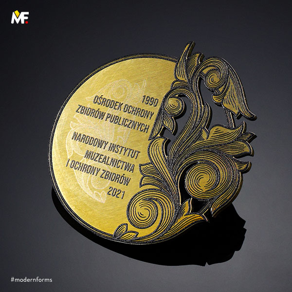 Medal nieregularny, ażurowany, jednoelementowy, dwustronny, wykonany ze stali szczotkowanej lakierowanej na kolor złoty. Teksturowany przestrzennie z dopasowaną kolorystycznie wstążką. Istnieje możliwość dopasowania wzoru do wytycznych klienta.
