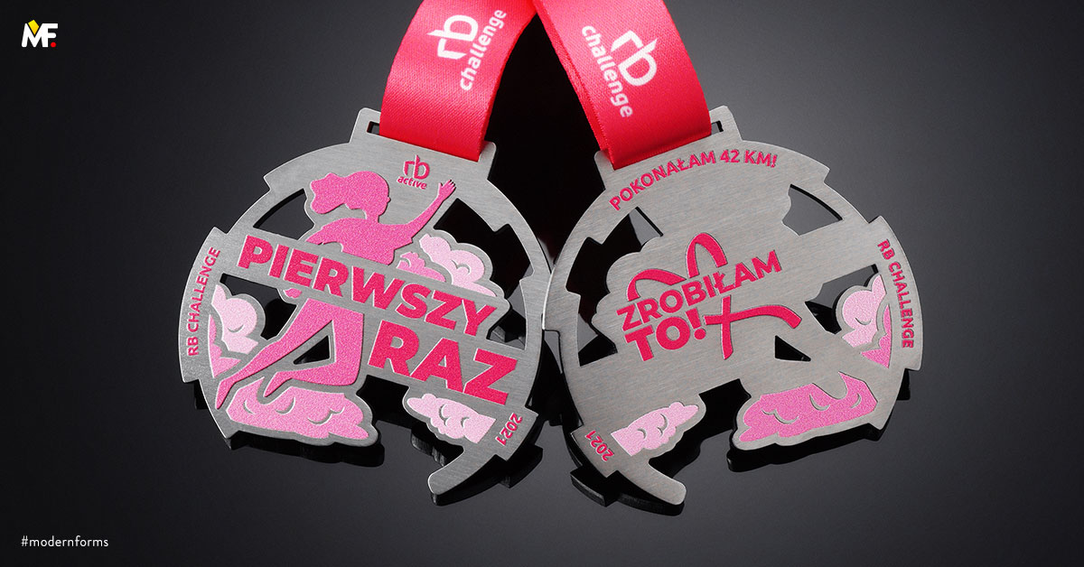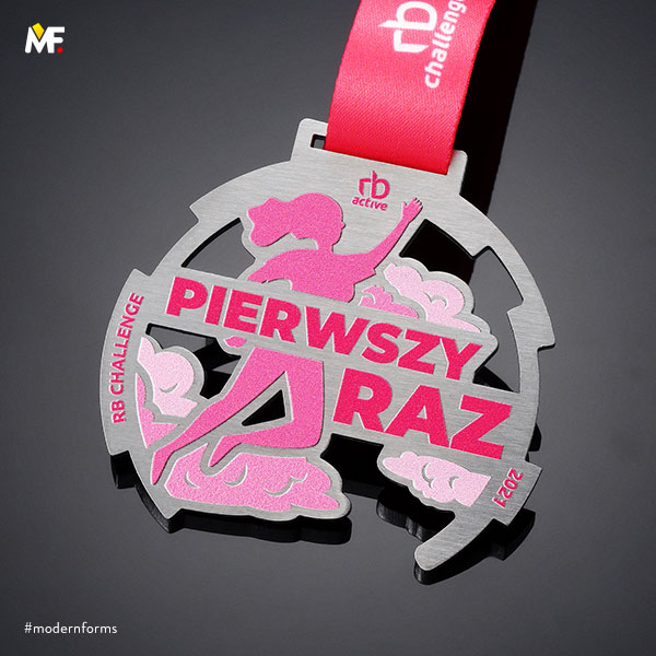 Medal nieregularny, ażurowany, jednoelementowy, dwustronny, wykonany z stali szczotkowanej. Teksturowany przestrzennie z dopasowaną kolorystycznie wstążką z nadrukiem. Istnieje możliwość dopasowania wzoru do wytycznych klienta.