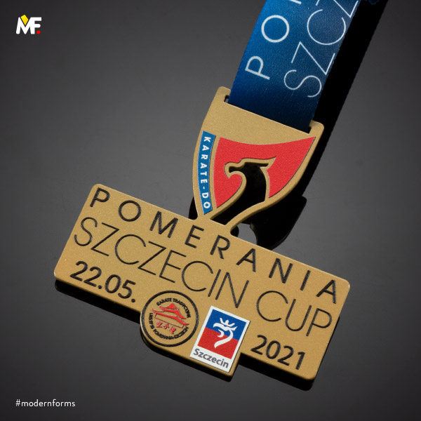 Medal nieregularny, ażurowany, jednoelementowy, jednostronny, wykonany z metalu malowanego na kolor złoty, srebrny, brązowy. Teksturowany przestrzennie z dopasowaną kolorystycznie wstążką z nadrukiem. Istnieje możliwość dopasowania wzoru do wytycznych klienta.