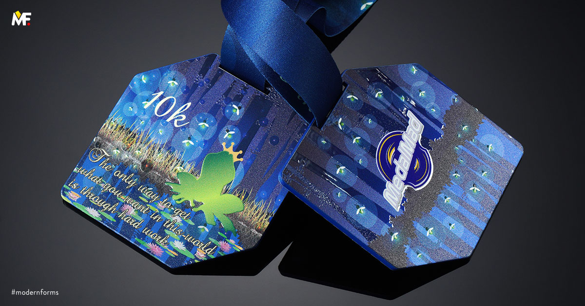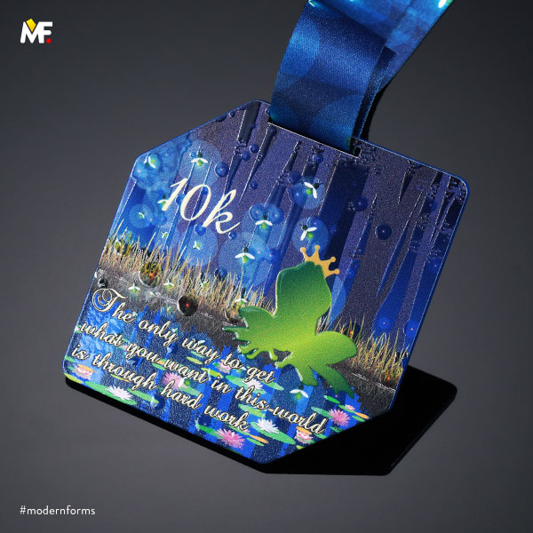 Medal nieregularny, jednoelementowy, dwustronny, wykonany z metalu malowanego na kolor niebieski. Teksturowany przestrzennie z dopasowaną kolorystycznie wstążką z nadrukiem. Istnieje możliwość dopasowania wzoru do wytycznych klienta.