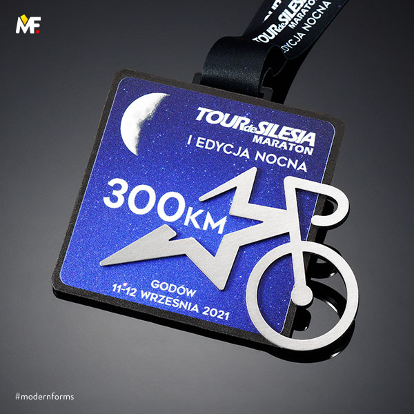 Medale o nieregularnym kształcie, dwuelementowe, dwustronne, wykonane ze stali szczotkowanej oraz stali czarnej malowanej na kolor czarny. Teksturowany przestrzennie z dopasowaną kolorystycznie wstążką z nadrukiem. Istnieje możliwość dopasowania wzoru do wytycznych klienta.
