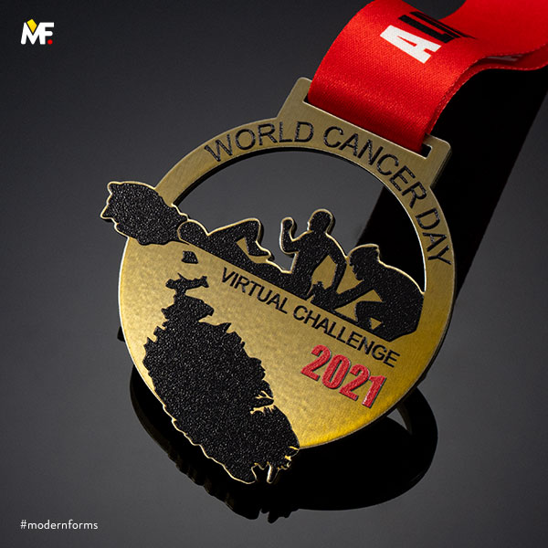 Medal nieregularny, ażurowany, jednoelementowy, jednostronny, wykonany ze stali szczotkowanej malowanej na kolor złoty. Teksturowany przestrzennie z dopasowaną kolorystycznie wstążką z nadrukiem. Istnieje możliwość dopasowania wzoru do wytycznych klienta.
