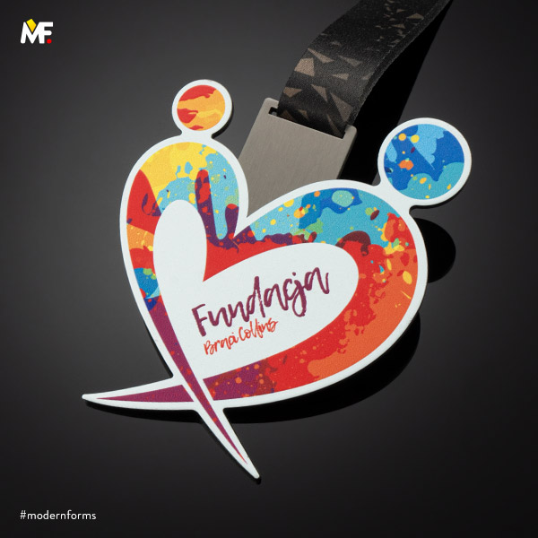 Duży kolorowy medal z postaciami ułożonymi w kształ serca, jednoelementowy, dwustronny, wykonany z metalu malowanego ma kolor złoty oraz srebrny. Teksturowany przestrzennie z dopasowaną kolorystycznie wstążką z nadrukiem. Istnieje możliwość dopasowania wzoru do wytycznych klienta.