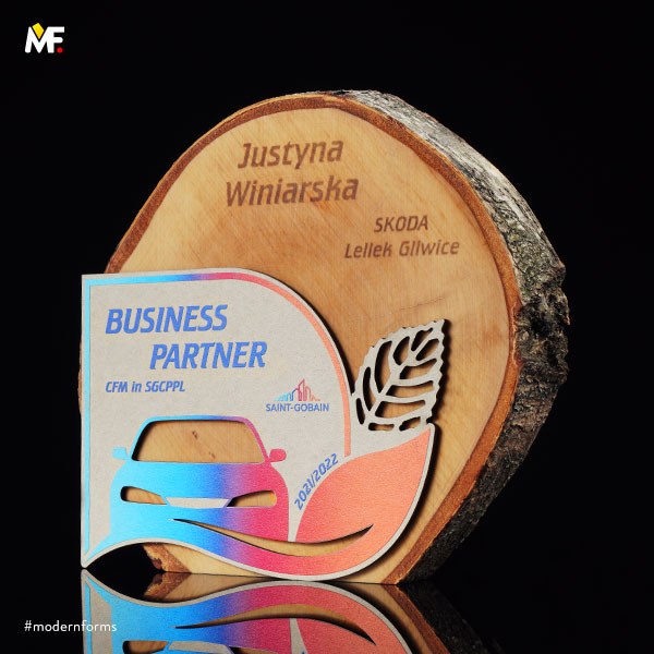 Statuetka dla partnera biznesowego z motywem auta i liścia, wykonana z tektury recyklingowej z zadrukiem oraz naturalnego drewna. Nowoczesny design przygotowany na specjalne zamówienie. Panel został osadzony na podstawie z drewna. Istnieje możliwość dostosowania wzoru do wytycznych klienta.