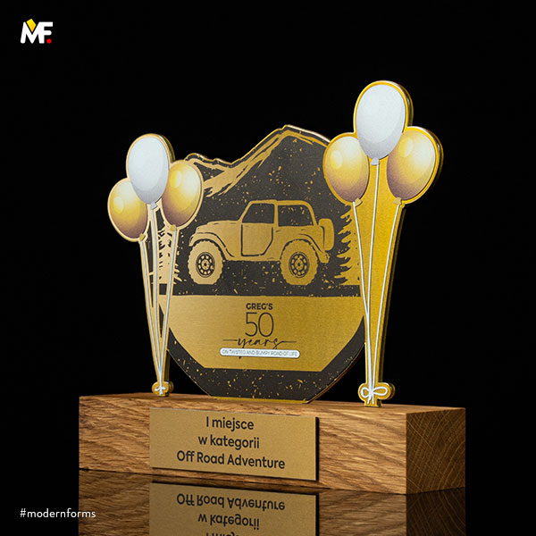 Jednopanelowa statuetka, wykonana ze stali szczotkowanej lakierowanej na kolor złoty, bezbarwny oraz brązowy. Nowoczesny design przygotowany na specjalne zamówienie. Panel został osadzony na drewnianej podstawie. Istnieje możliwość dostosowania wzoru do wytycznych klienta.