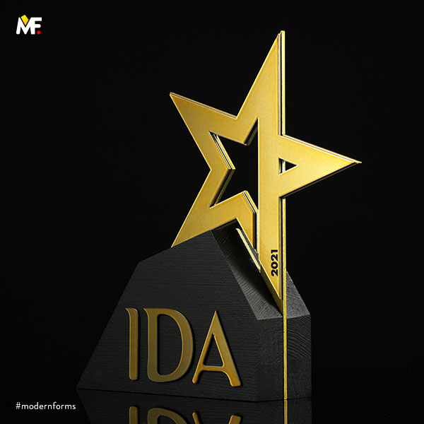 Jednopanelowa statuetka wykonana ze stali szczotkowanej malowanej na kolor złoty. Nowoczesny design przygotowany na specjalne zamówienie. Panel został osadzony na podstawie z drewna. Istnieje możliwość dostosowania wzoru do wytycznych klienta.