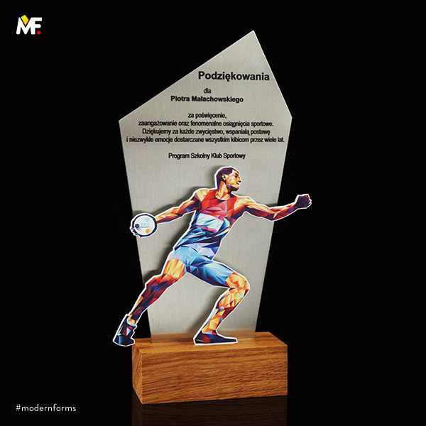Dwupanelowa statuetka wykonana ze stali czarnej malowanej na kolor srebrny oraz stali nierdzewnej. Nowoczesny design przygotowany na specjalne zamówienie. Panel został osadzony na drewnianej podstawie. Istnieje możliwość dostosowania wzoru do wytycznych klienta.