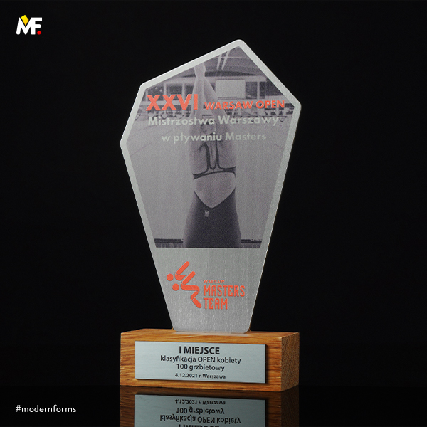 Jednopanelowa statuetka, wykonana ze stali szczotkowanej. Nowoczesny design przygotowany na specjalne zamówienie. Panel został osadzony na drewnianej podstawie. Istnieje możliwość dostosowania wzoru do wytycznych klienta.