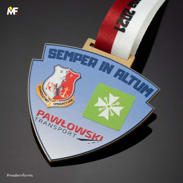 Medal nieregularny, jednoelementowy, dwustronny, wykonany z metalu malowanego na kolor złoty. Teksturowany przestrzennie z dopasowaną kolorystycznie wstążką z nadrukiem. Istnieje możliwość dopasowania wzoru do wytycznych klienta.